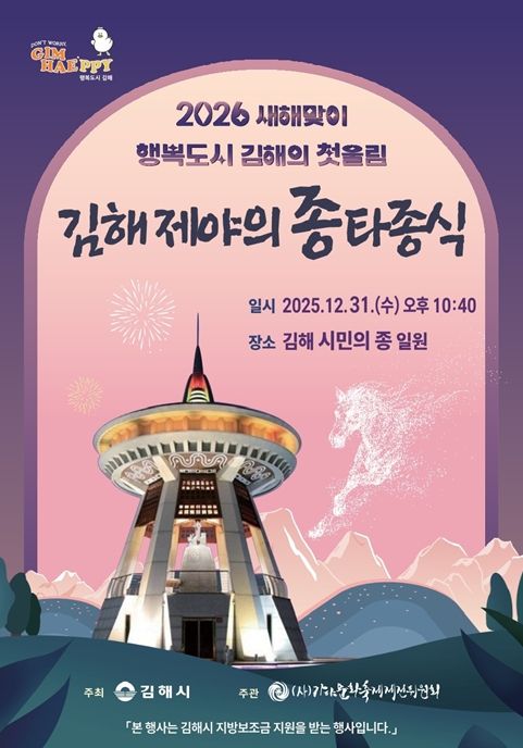김해시 관계자는 “김해시민의 종은 가야의 역사와 시민의 염원이 담긴 상징적인 공간”이라며 “시민이 직접 참여해 희망과 화합의 메시지를 나누고 시민 모두에게 희망찬 새해의 첫 울림이 전해지길 바란다”고 밝혔다.