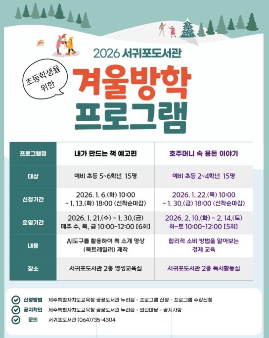 [ 중앙뉴스미디어 ] 제주도교육청 서귀포도서관은 겨울방학을 맞아 어린이들의 호기심을 자극해 책 읽기의 즐거움과 경제 감각을 키우는 겨울방학 프로그램을 운영하며, 내년 1월 6일부터 참가자를 모집한다.