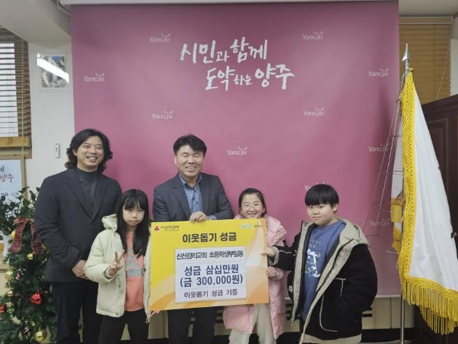 [ 중앙뉴스미디어 ] 양주시 남면 신산감리교회 초등부 4학년반 학생들은 지난 23일 남면 행정복지센터를 방문해 이웃돕기 성금을 전달하며 이웃사랑 실천에 앞장섰다.