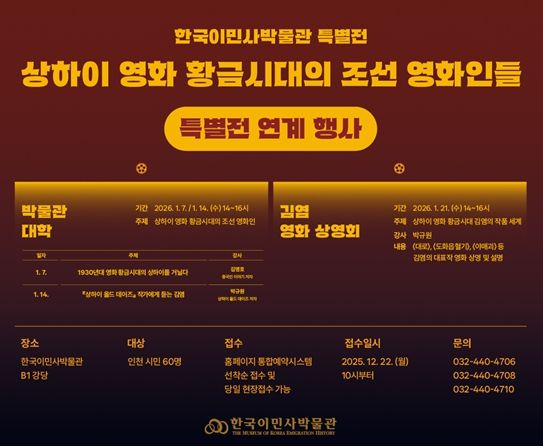 [ 중앙뉴스미디어 ] 인천광역시 시립박물관 분관 한국이민사박물관은 특별전 〈상하이 영화 황금시대의 조선 영화인들〉과 연계해 유명 작가 초청 특강을 개최한다고 밝혔다.
