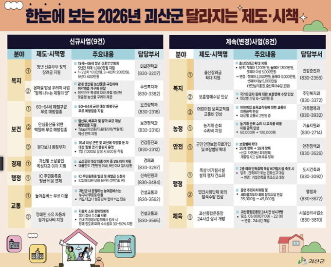 [ 중앙뉴스미디어 ] 충북 괴산군은 2026년 병오년 새해를 맞아 군민의 일상에서 '바로 체감되는 변화'를 만드는 생활밀착형 정책을 본격 시행한다.