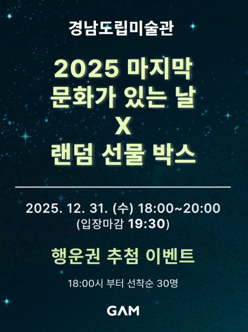 [ 중앙뉴스미디어 ] 경남도립미술관은 12월 31일 ‘문화가 있는 날’을 맞이해 연말을 함께 즐길 수 있는 특별 이벤트를 마련한다고 밝혔다.