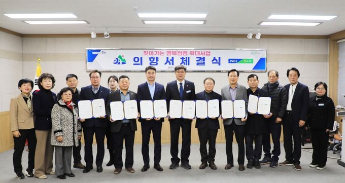 이날 체결식에는 진병영 함양군수, 노춘석 농협중앙회 함양군지부장, 강선욱 함양농협 조합장, 조원래 마천농협 조합장, 임종식 수동농협 조합장, 김기종 안의농협 조합장, 강순현 지곡농협 조합장이 참석했으며, 박윤섭 함양군이장단협의회장과 김종화 새마을운동중앙회 함양군지회장 등이 함께해 행복점빵 확대 사업의 성공적인 추진에 힘을 모으기로 약속했다.