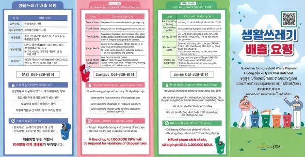 [ 중앙뉴스미디어 ] 외국인 거주자와 근로자가 생활폐기물 배출 방법을 쉽게 이해하고 올바르게 실천할 수 있도록 나주시가 다국어 홍보물을 제작해 무단투기 예방과 쾌적한 도시환경 조성에 나선다.