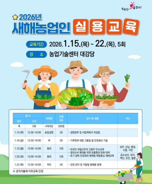 [ 중앙뉴스미디어 ] 성주군은 오는 1월 15일부터 22일까지 농업기술센터 대강당에서 지역 농업인 350여명을 대상으로 '2026년 새해농업인실용교육'을 실시한다.