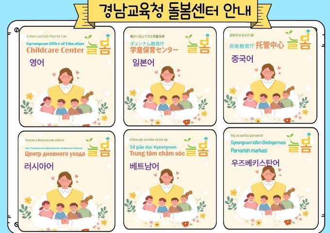 [ 중앙뉴스미디어 ] 경상남도교육청은 다문화 가정과 외국인 학부모가 돌봄 서비스를 쉽게 이해할 수 있도록 경남교육청 돌봄센터 ‘늘봄’ 안내자료를 6개 국어로 제작해 배포했다. 지원 언어는 영어, 일본어, 중국어, 베트남어, 러시아어, 우즈베키스탄어이다.