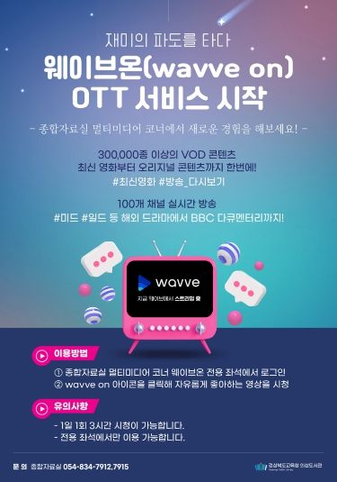[ 중앙뉴스미디어 ] 경상북도교육청 의성도서관(관장 이미경)은 오는 13일부터이용자가 필요로 하는 영상을 실시간으로 제공하는 ‘웨이브온 VOD(Video On Demand)’ 서비스를 운영한다고 밝혔다.