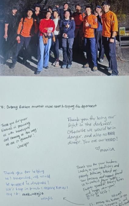 9일 경기도북부소방재난본부에 따르면 지난해 11월 북한산에서 조명 장비 없이 야간 하산을 시도하다 조난을 당한 싱가포르 국적 관광객 4명이 지난달 말 고양소방서에 감사 편지를 보냈다.