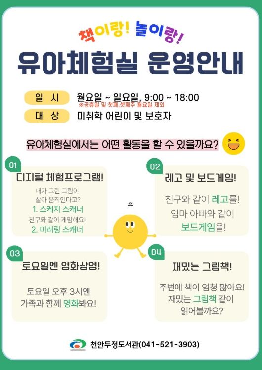 [ 중앙뉴스미디어 ] 천안시 두정도서관은 미취학 아동을 위한 ‘놀이 기반 독서 환경’인 유아체험실을 운영해 주민들로부터 호응을 얻고 있다고 12일 밝혔다.
