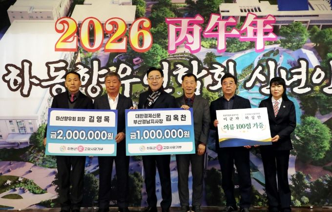 [ 중앙뉴스미디어 ] 하동군은 지난 9일 개최된 ‘전국하동향우연합회 2026년 신년인사회’에서 김영목 마산향우회장과 김옥찬 대한경제신문 부산·경남 지사장이 각각 고향사랑기부금 200만 원, 100만 원을 전달했다고 밝혔다.