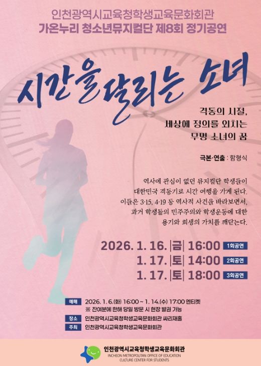 [ 중앙뉴스미디어 ] 인천광역시교육청학생교육문화회관은 가온누리 청소년뮤지컬단 제8회 정기공연 ‘시간을 달리는 소녀’를 16일부터 17일까지 싸리재홀 대공연장에서 개최한다.