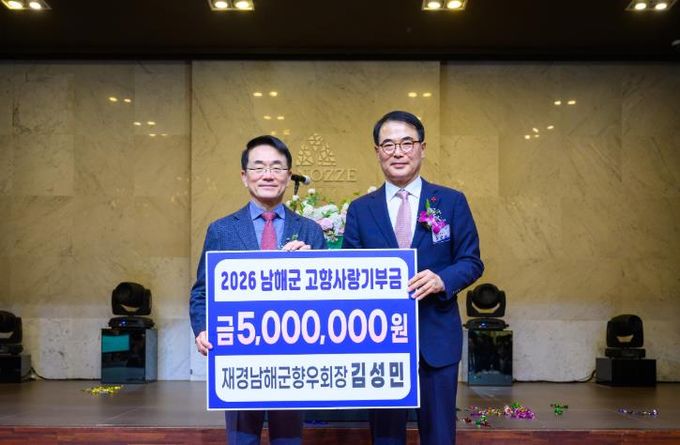 [ 중앙뉴스미디어 ] 재경남해군향우회 김성민 회장이 지난 6일 서울에서 열린 ‘2026년 재경향우회 신년하례회’에서 남해군의 발전을 위해 고향사랑기부금 500만 원을 기탁했다.
