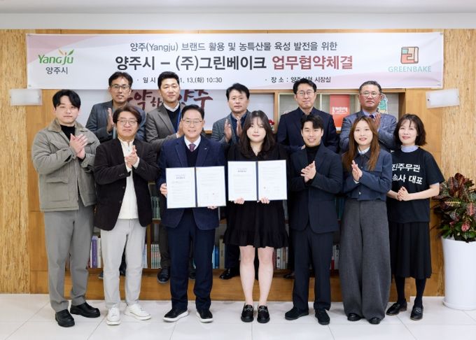 [ 중앙뉴스미디어 ] 양주시는 13일 오전 ㈜그린베이크와 ‘양주(Yangju) 브랜드 활용 및 농특산물 육성 발전을 위한 업무협약(MOU)’을 체결했다고 밝혔다.