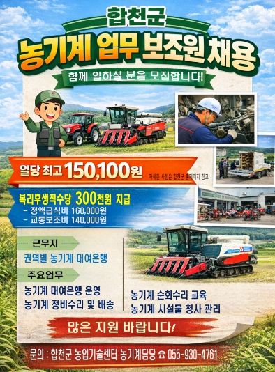 [ 중앙뉴스미디어 ] 합천군은 농기계대여은행 운영체계를 강화하고 농업인 영농 편의를 높이기 위해 2026년 농기계 업무보조원 기간제근로자 9명을 채용한다고 14일 밝혔다.