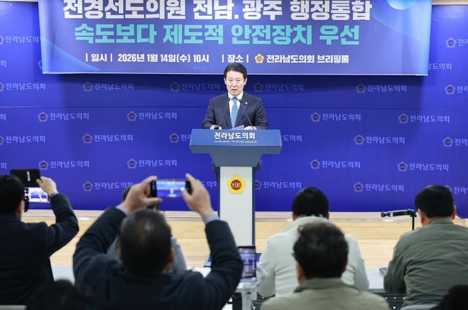 [ 중앙뉴스미디어 ] 전라남도의회 전경선 의원(더불어민주당·목포5)은 14일, 전라남도의회 브리핑룸에서 기자회견을 열고, 전남-광주 행정통합과 관련해 “통합의 큰 방향과 대의에는 동의하며 적극 지지하지만, 속도전 통합이 아닌 제도적 안전장치가 우선돼야 한다”고 밝혔다.