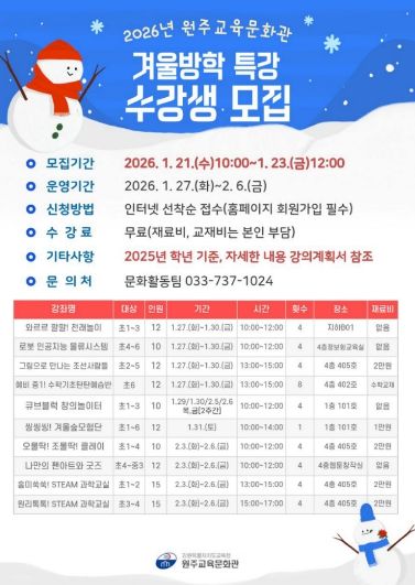 [ 중앙뉴스미디어 ] 원주교육문화관(관장 용석태)은 1월 21일부터 23일까지 관내 초·중학생을 대상으로 겨울방학 특강 수강생을 모집한다.