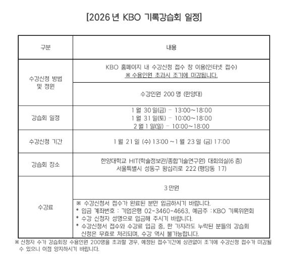 [ 중앙뉴스미디어 ] 2026년 KBO 기록강습회가 1월 30일(금)부터 2월 1일(일)까지 서울 한양대학교에서 개최된다. 기록강습회는 야구 공식기록법의 보급과 이해를 통한 저변 확대를 목적으로 프로야구 원년인 1982년부터 개최됐다.
