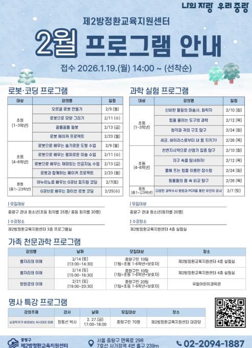 2월 겨울방학 특강은 로봇·코딩 프로그램과 과학 실험 프로그램을 중심으로 운영되며, 가족이 함께 참여하는 천문과학 프로그램을 포함해 구성됐다. 특히 천문과학 프로그램은 국립어린이과학관을 방문해 가족이 함께 전시와 체험 활동에 참여하는 방식으로 운영돼, 보다 생생한 과학 학습 경험을 제공할 예정이다. 2월 프로그램은 1월 19일부터 제2방정환교육지원센터 누리집을 통해 온라인 선착순 접수를 진행한다.
