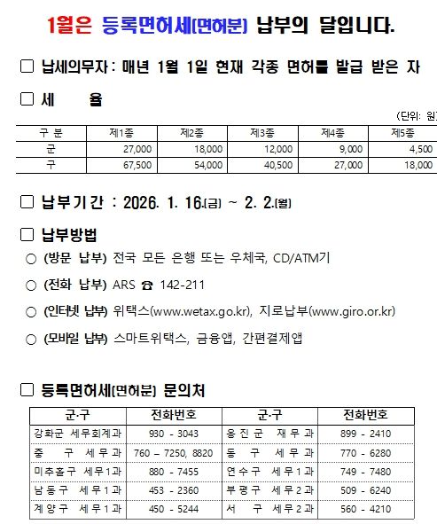 [ 중앙뉴스미디어 ] 인천광역시는 2026년 정기분 등록면허세(면허분) 396,262건, 총128억 원을 부과·고지했다고 밝혔다.