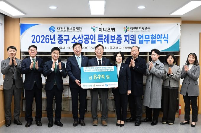 [ 중앙뉴스미디어 ] 대전 중구는 지난 2024년과 2025년에 이어 올해에도 중구 관내 소상공인 경영안정자금 지원을 위해 대전신용보증재단, 하나은행과 협약을 맺고 총 84억 원 규모의 소상공인 특례 보증을 지원한다고 15일 밝혔다.
