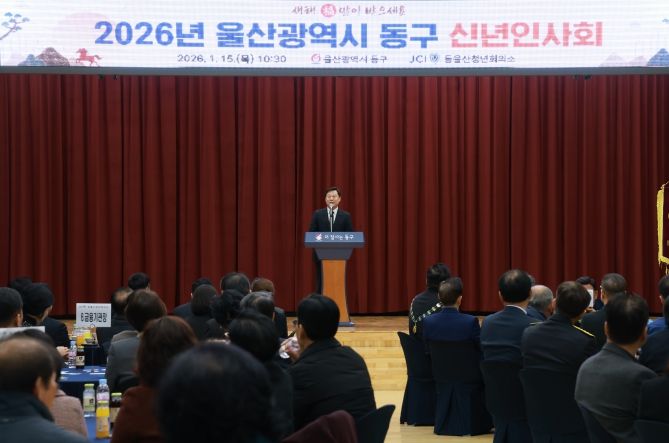 [ 중앙뉴스미디어 ] 울산 동구는 1월 15일 오전 10시 30분 동구청 2층 대강당에서 2026년 울산광역시 동구 신년 인사회를 개최했다.