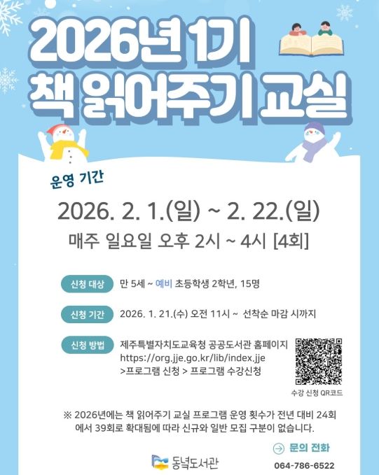 [ 중앙뉴스미디어 ] 제주도교육청 동녘도서관은 2월 1일부터 22일까지 평생교육실에서 유아 및 저학년 어린이의 독서 흥미와 창의력 향상을 위한 ‘2026년 1기 책 읽어주기 교실’을 운영한다.