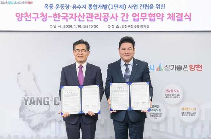 [ 중앙뉴스미디어 ] 양천구가 1월 16일 한국자산관리공사와 업무협약을 체결하며, 목동운동장·유수지 일대 통합개발(목동MICE)을 위한 첫걸음을 내디뎠다.