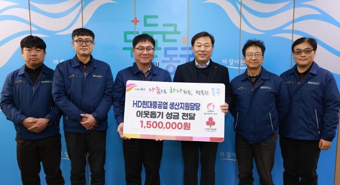 [ 중앙뉴스미디어 ] HD현대중공업 생산지원담당(부서장 박필용 수석)은 1월 16일 오전 10시 동구청을 방문해 이웃돕기 성금 150만 원을 전달했다.