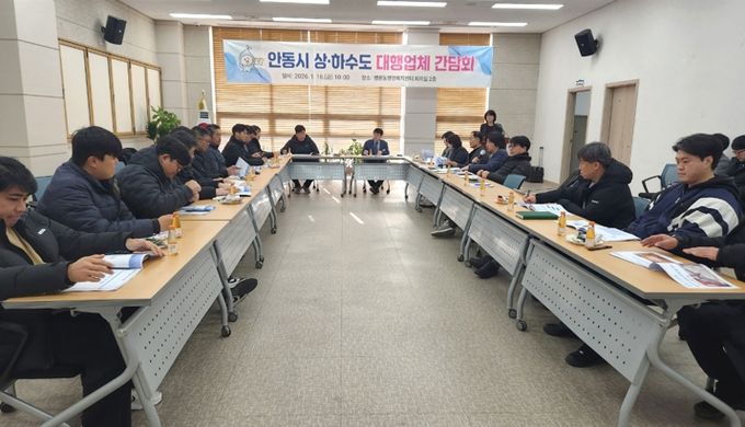 [ 중앙뉴스미디어 ] 안동시는 1월 16일 명륜동행정복지센터 2층 회의실에서 상․하수도 대행업체 10개 사 대표와 시청 직원 등 30여 명이 참석한 가운데, 대행사업 품질 향상 및 상호 협력 강화를 위한 ‘상하수도 대행업체 간담회’를 개최했다.