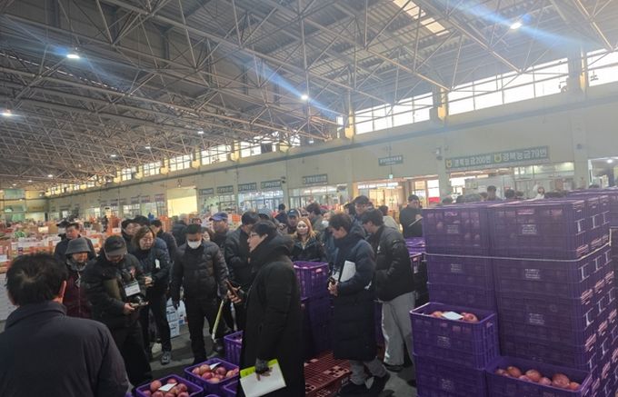 이날 경매 현장에는 이현주 농업기술센터소장을 비롯해 대경사과원예농협 포항APC장장, 도매시장 법인대표, 도매시장 및 관계자 등이 참석했다.