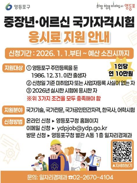 최호권 영등포구청장은 “청년 구직자는 취업 경쟁력을 높이고, 중장년과 어르신 구직자는 새로운 도전을 이어갈 수 있도록 적극 지원하겠다”라며 “연령대별 구직 여건에 맞춰 구민 누구나 자격 취득에 도전할 수 있도록 체계적인 지원을 이어가겠다”라고 말했다.