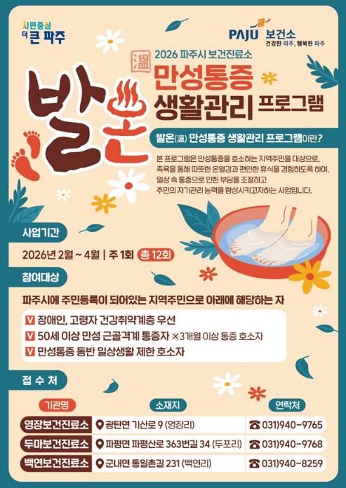 [ 중앙뉴스미디어 ] 파주시 보건진료소는 보건의료 취약지역 주민들의 건강증진을 위해 2026년 ‘발온(溫) 만성통증 생활관리’교실을 운영한다.