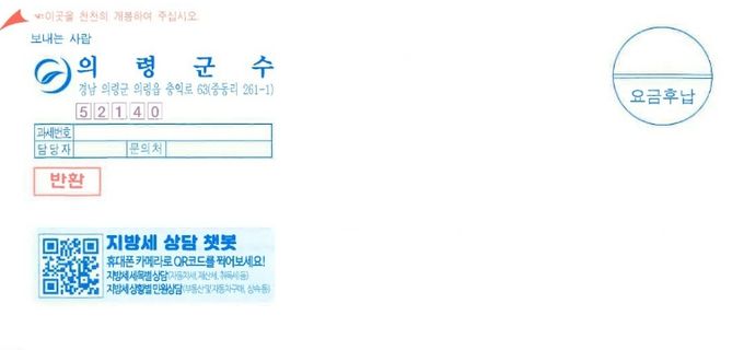 [ 중앙뉴스미디어 ] 의령군은 지방세 고지서 전면에 ‘지방세 챗봇 상담서비스’ QR코드를 삽입해 발송한다고 밝혔다.