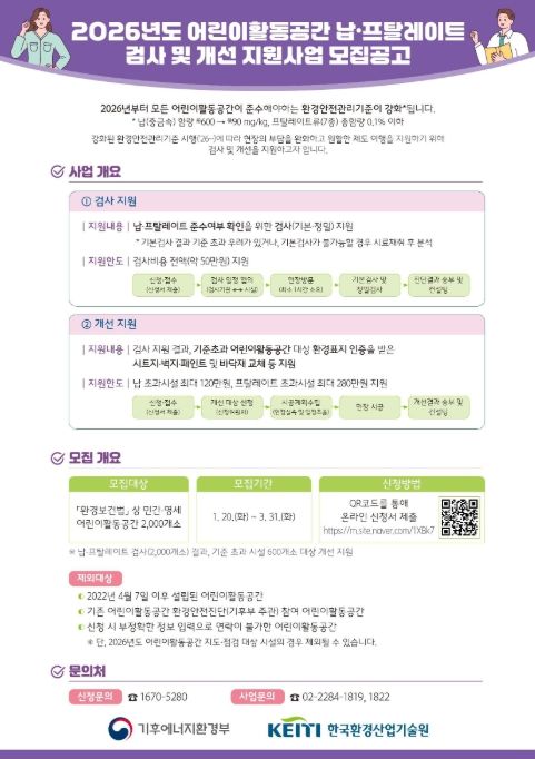기후에너지환경부는 강화된 기준 준수에 어려움을 겪는 민간 영세시설을 돕기 위해 1월 20일부터 지원 대상을 모집한다. 우선 2,000곳을 대상으로 환경안전관리기준 검사를 무상으로 실시한다. 검사 결과 기준을 초과한 시설 가운데 600곳을 선정해 안전한 제품으로 교체ㆍ재시공하는 데 드는 비용 일부를 지원할 예정이다.