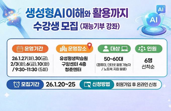 교육 과정은 생성형 AI의 기본 개념부터 일상과 업무에 활용할 수 있는 실습 중심 내용으로 구성되며, 50~60대 컴퓨터·인터넷 활용이 가능한 주민을 대상으로 진행된다.