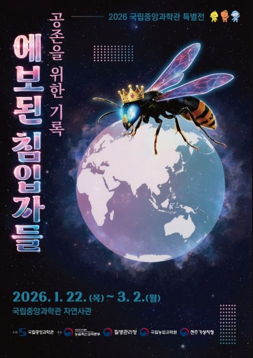 [ 중앙뉴스미디어 ] 미래의 꿈을 만드는 과학기술 문화 이음터(플랫폼) 과학기술정보통신부 국립중앙과학관은 1월 22일부터 3월 2일까지 자연사 관에서 인공지능(AI) 기술을 활용해 다양한 기후변화에 따른 해충의 위협과 슬기로운 대응을 다룬 해충특별전 ‘2026년 예보된 침입자들: 공존을 위한 기록’을 개최한다고 밝혔다.