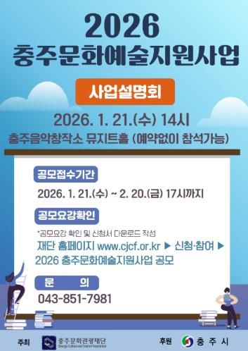 [ 중앙뉴스미디어 ] (재)충주문화관광재단은 충주시 예술인 및 예술단체의 창작활동 기반을 마련하여 문화예술 생태계를 조성하고자 1월 19일부터‘2026 충주문화예술지원사업’공모를 진행하고 있다고 밝혔다.