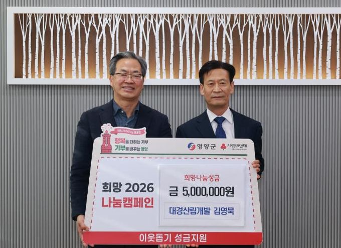 [ 중앙뉴스미디어 ] 대경산림개발 대표 김영묵(전 농업경제건설국장)은 1월 21일 영양군을 방문해 지역의 어려운 이웃과 희망을 나누고자 성금 500만원을 기부하며 '희망2026나눔캠페인'에 동참했다.