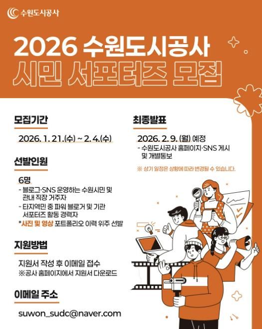 [ 중앙뉴스미디어 ] 수원도시공사가 21일부터 다음 달 4일까지 2026년도 제8기 시민 서포터즈를 모집한다.