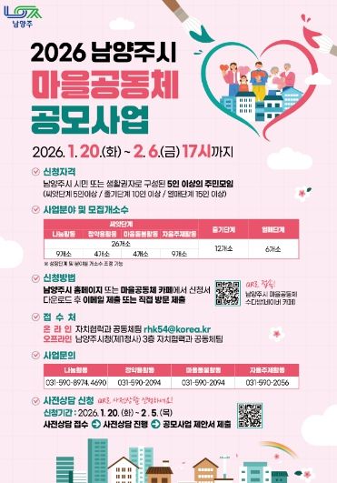 [ 중앙뉴스미디어 ] 남양주시는 1월 20일부터 2월 6일까지 ‘2026년 마을공동체 공모사업’참여 공동체를 공개 모집한다.