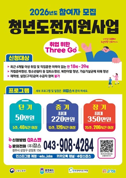 [ 중앙뉴스미디어 ] 충북경제자유구역청은 구직 의욕이 낮아진 도내 청년들의 원활한 사회 진출을 돕기 위해 고용노동부가 주관하는 ‘2026년 청년도전 지원사업’의 국비 11억 6,000만 원을 확보하고 본격적인 참여자 모집에 나선다고 밝혔다.