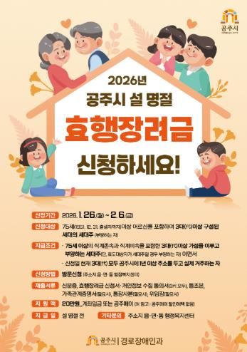 [ 중앙뉴스미디어 ] 공주시는 지역사회 효 문화 확산과 효행 문화 발전을 위해 설 명절을 맞아 ‘효행장려금’을 지급한다고 22일 밝혔다.