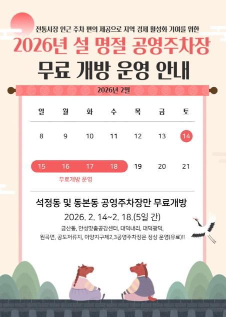 [ 중앙뉴스미디어 ] 안성시시설관리공단은 2026년 설 명절을 맞아 2월 14일부터 18일까지 5일간, 공단이 관리하는 공영주차장 중 전통시장 인근에 위치한 석정동 공영주차장과 동본동 공영주차장을 한시적으로 무료 개방한다고 밝혔다.