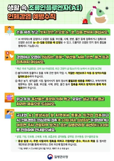 이에 따라 화순군은 ▲철새·야생조류 및 폐사한 조류와 접촉금지 ▲조류인플루엔자 발생 가금농장 방문하지 않기 ▲씻지 않은 손으로 눈·코·입 만지지 않기 ▲외출 후 손 씻기 ▲필요시 마스크 등 개인보호구 착용 ▲기침 예절 준수 등 생활 속 예방 수칙 실천을 강조했다.