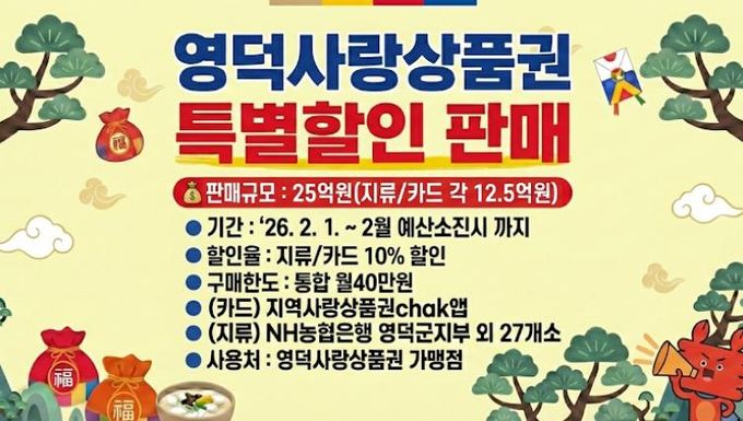 [ 중앙뉴스미디어 ] 영덕군은 설 명절을 앞두고 지역 상권 활성화와 소비 촉진을 위해 2월 1일부터 ‘영덕사랑상품권’을 10% 특별 할인 판매한다.