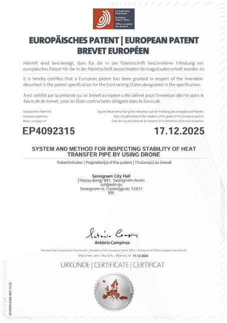 [ 중앙뉴스미디어 ] 성남시가 자체 개발한 ‘드론을 이용한 열수송관 안정성 검사 시스템’이 유럽특허(등록번호 EP4092315) 등록을 완료했다고 밝혔다. 이는 시 최초의 해외특허 등록 사례로, 지식재산의 해외 권리화를 통해 유럽 수출길을 여는 계기가 될 것으로 기대된다.