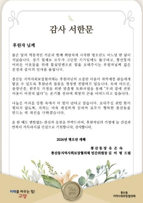 [ 중앙뉴스미디어 ] 고양특례시 일산동구 풍산동 지역사회보장협의체는 설명절을 앞둔 지난 3일 지난해 지역사회의 어려운 이웃을 위해 따뜻한 나눔을 실천한 후원자들에게 감사의 마음을 담은 서한문을 발송했다.