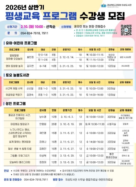 [ 중앙뉴스미디어 ] 경상북도교육청 의성도서관은 지역주민의 평생학습 기회를 확대하고 삶의 질 향상을 도모하기 위해 2월 10일(화)부터 상반기 평생교육 프로그램 수강생을 모집한다고 밝혔다.