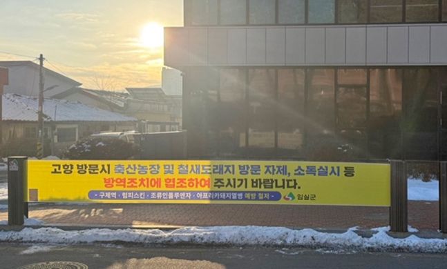 [ 중앙뉴스미디어 ] 임실군은 설 명절을 앞두고 조류인플루엔자(AI), 아프리카돼지열병(ASF) 등 가축질병의 확산을 예방하기 위해 고향 방문시 축산농장 및 철새도래지 방문 자제 협조를 당부하는 홍보 현수막을 12개 읍·면 및 주요 도로변 게시판 20개소에 설치했다.