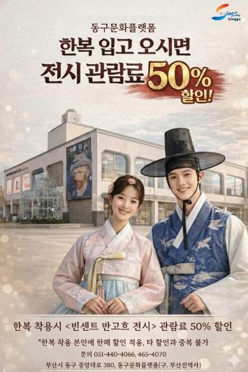 [ 중앙뉴스미디어 ] 부산 동구는 한복 입기 활성화를 위해 한복을 착용하고 방문한 관람객을 대상으로 동구 문화플랫폼 전시 관람료 할인 이벤트를 진행한다.